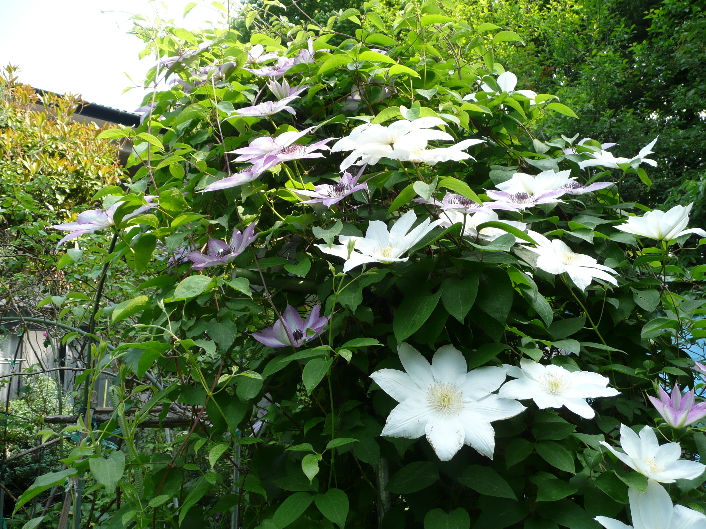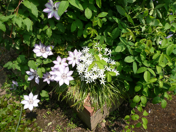どこにでも節操なく生えてくるカモミール でも、かわいくて何ヶ所かは残して楽しんでます 時には5・6花カップにいれ熱湯を注ぎ、ハーブティーで 精神安定の効果があるとか・・・いやされる(´∀`*) クレマチスいろいろ ばらと同時期に咲いて欲しいのに・・・ ちらほらバラも・・・まだまだですが