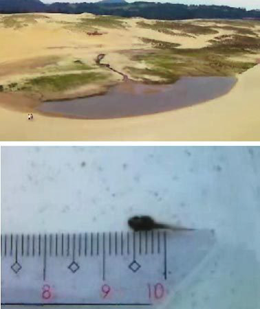 鳥取砂丘の水たまり「オアシス」でこのほど、オタマジャクシが泳ぎ回る姿が初めて確認された。専門家によると、オアシスで以前から生息が確認されていたアマガエルのオタマジャクシにほぼ間違いないという。夏は蒸発、浸透して姿を消すオアシス周辺で繁殖している可能性が高いことも分かった