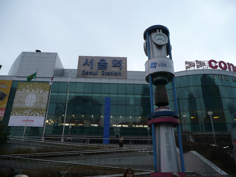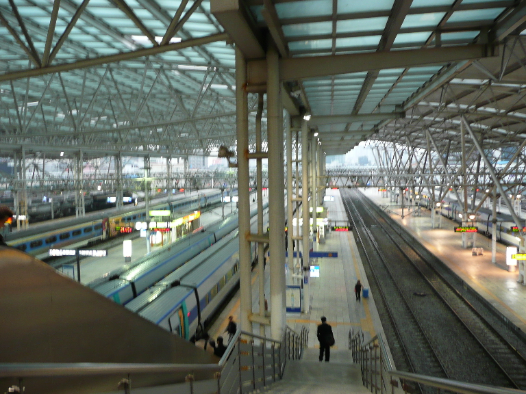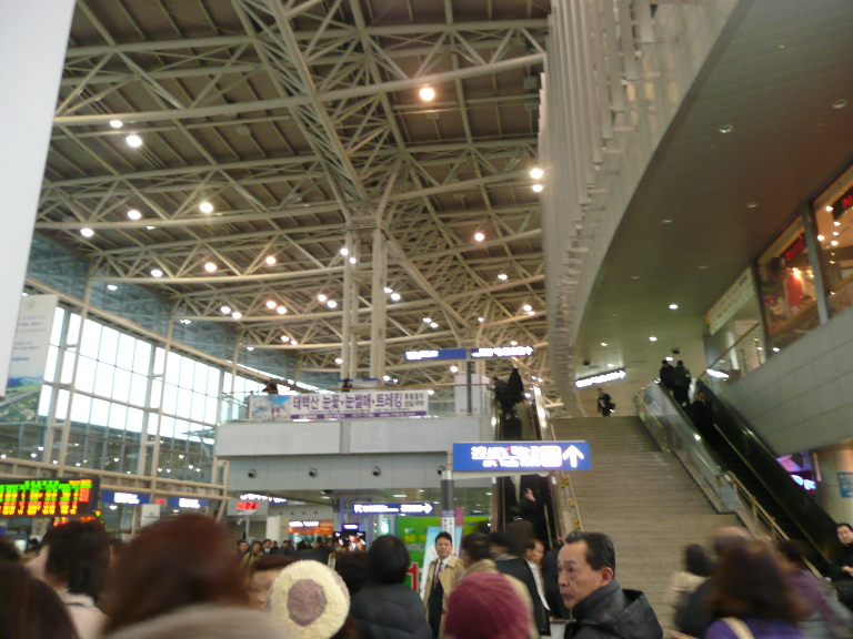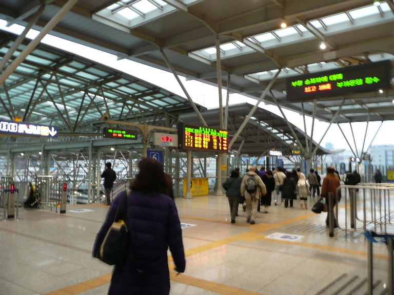 ソウル駅~出勤時間帯でものすごい混雑です。京義線ホーム~乗る人が少ない。