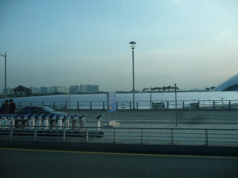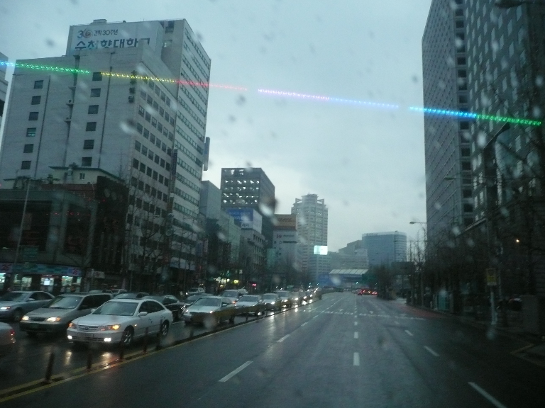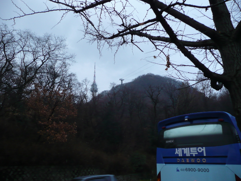 朝のレストラン。遠くに霞んでいるのがソウルタワー。ソウルタワーへのケーブルカー。8車線の広い道路