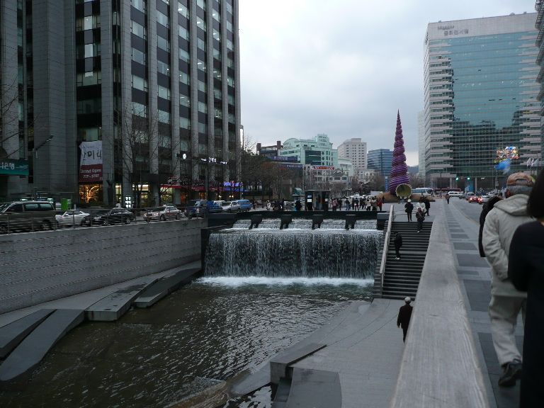 清渓川~ソウルのど真ん中で公園のようです。ビルと川がとてもおしゃれです。
