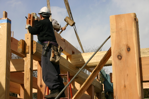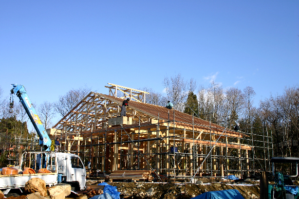 以前、UPした丸太梁が今じゃすっかり組まれて完成間近です