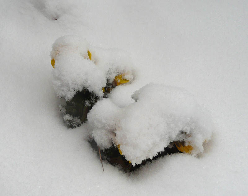 正午には10㎝の積雪になって輝かしく咲いていたフクジュソウもびっくりです