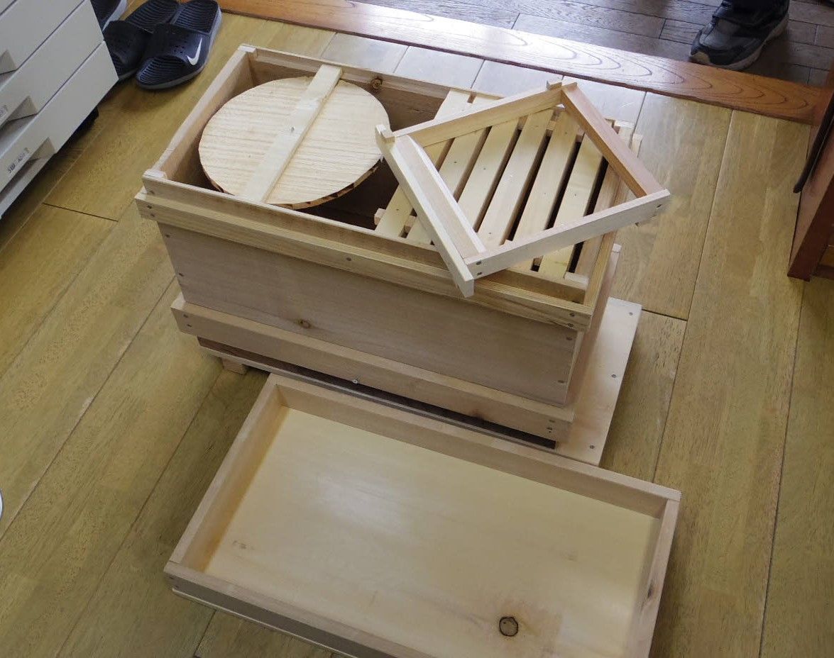 左の箱はミツバチに気に入ってもらえるよう工夫した巣箱だそうで